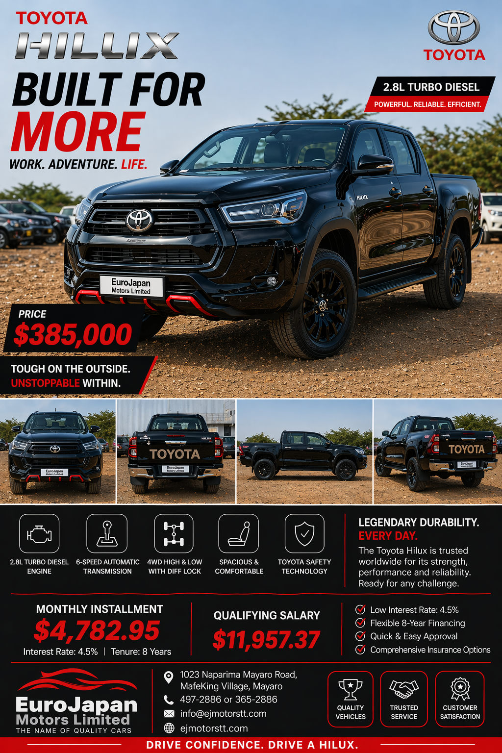 The latest India-market Hilux Black Edition is based on the top-spec High AT 4×4 available in showroom for $385,000 tt.